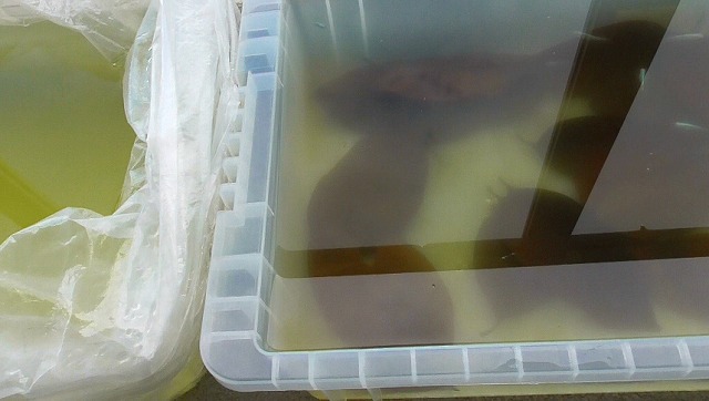 2ヵ月ほど、水替えなし・足し水だけ・葉っぱを沈めていたわりに、水は汚れていない方だと思います。